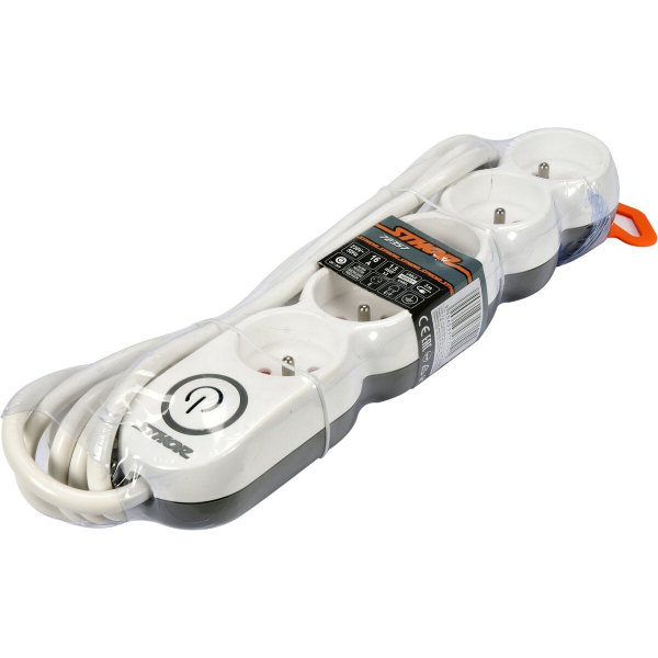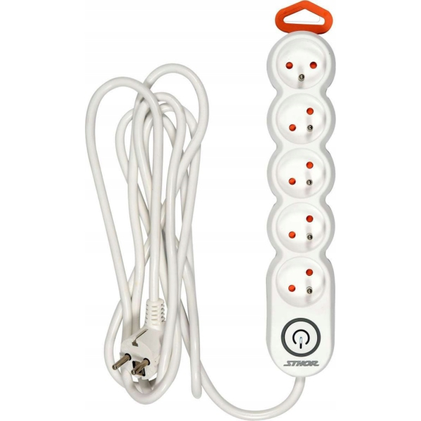 Подовжувач електромережевий Sthor 72357 на 5 розеток із заземленням. Довжина 3 м. Перетин дроту 1.5 мм². Трижильний. Є вимикач та захист від дітей.