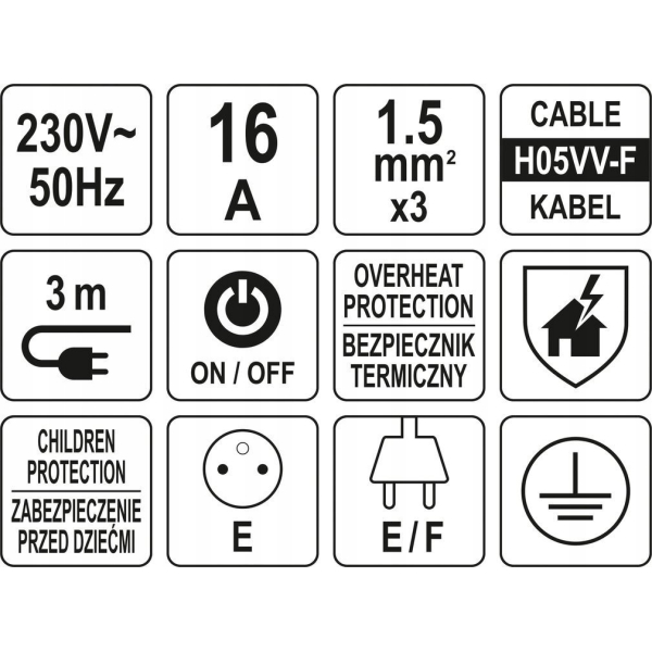- Тривале споживання струму понад максимальне навантаження подовжувача може призвести до перегріву шнура і, як наслідок, до пожежі. Автоматичний запобіжник вимкне подовжувач у разі короткого замикання або надмірного тривалого споживання струму приєднаними до нього пристроями. Він має захист від теплового навантаження: 16А/250В.