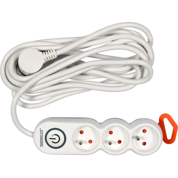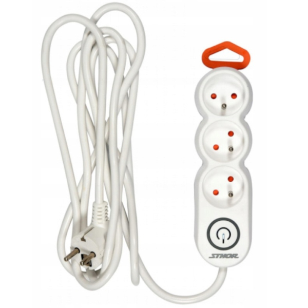 Подовжувач електромережевий Sthor 72352 на 3 розетки із заземленням. Довжина 5 м. Перетин дроту 1.5 мм². Трижильний. Є вимикач та захист від дітей.