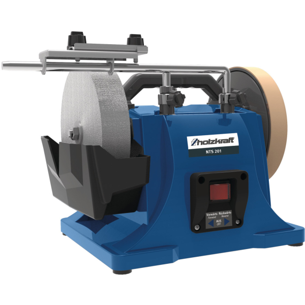 - Holzkraft NTS 201 оснащений функцією сухого і мокрого шліфування, що розширює його можливості. Верстат підтримує можливість перемикання напрямку обертання шліфувального круга — за годинниковою стрілкою і проти неї, що спрощує процес обробки різних матеріалів. Низька швидкість обертання в поєднанні з охолоджувальною водяною ванною запобігає перегріванню оброблюваного інструменту, зберігаючи його твердість і властивості.