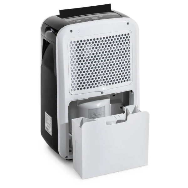 - Оснащений вбудованим резервуаром для збору води ємністю 2,3 л. Світловий індикатор рівня заповнення водою з автоматичним вимкненням у разі переповнення резервуара для збору вологи.