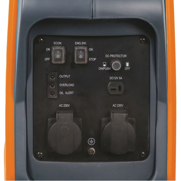 - Панель управління оснащена індикаторами вихідної напруги, перевантаження і рівня масла, так само тут розміщений цифровий мультиметр, на якому відображаються показники напруги, частоти і лічильник мотогодин.