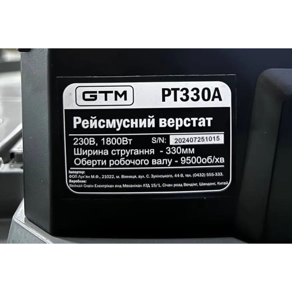 GTM PT330A – потужні верстат для рейсмусування заготовок до 152 мм завтовшки і шириною до 330 мм. Модель оснащена електромотором 1,8 кВт, який розганяє стругальний вал до 9500 об/хв. Два ножі за один прохід знімають шар стружки товщиною до 3 мм. Заготівля подається зі швидкістю 7,5 м/хв. Важить апарат 30,5 кг.