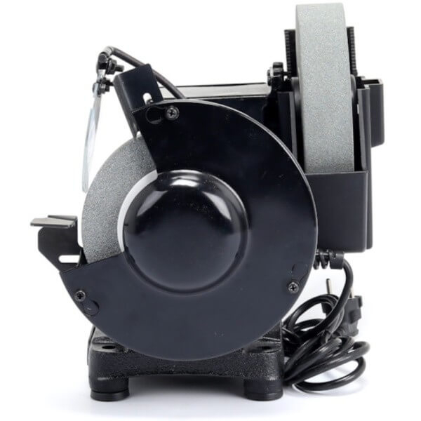 Для мокрого і сухого шліфування | Два модулі з шліфувальними кругами | Резервуар для води для постійного охолодження одного точильного каменю | Надійний металевий корпус | Захист від іскор | Різна швидкість обертання кругів | Упор для заготовок