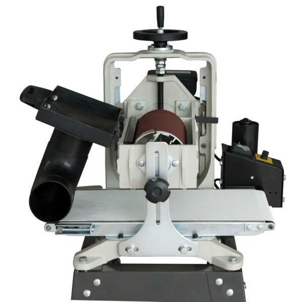Автоматичне регулювання швидкості конвеєра | Абразивна конвеєрна стрічка | Простий доступ до системи кріплення абразиву | Підключення пиловидалення | Чавунна конструкція | Транспортувальні коліщатка на ніжках