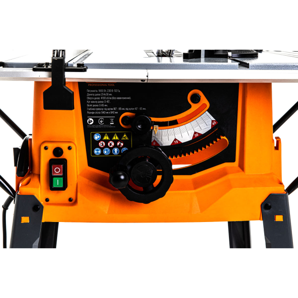 - Верстат оснащений паралельним упором на всю довжину столу і системою швидкої фіксації напрямної, що дозволяє швидко і точно встановлювати потрібні позиції для поздовжнього розпилу.