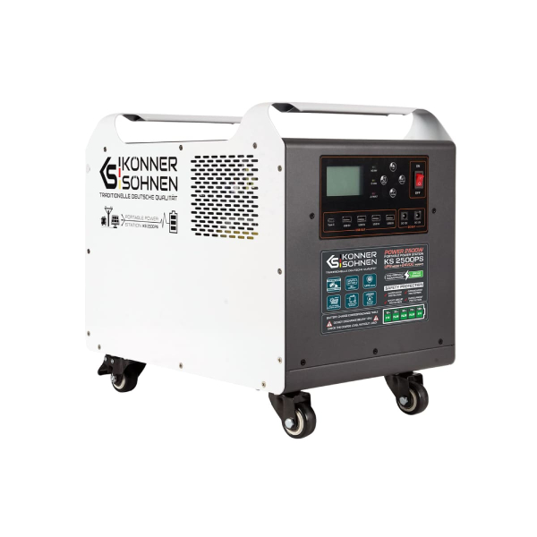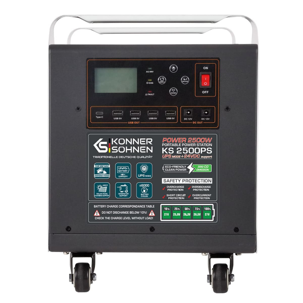 Konner&Sohnen KS 2500PS – потужне універсальне обладнання, яке поєднує в собі прилад безперебійного живлення, акумулятор і сонячний інвертор. Станція на 2500 Вт підходить для підключення різних електроприладів. Розрахована на 6000 циклів перезарядки. Має вхідну напругу 25.6 В. Вбудований акумулятор LifePo4 має ємність 100 Ah/2560 Вт год.