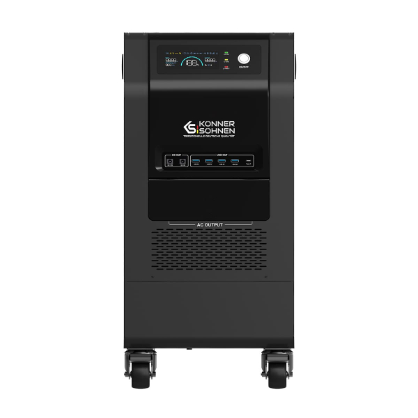 Konner&Sohnen KS 5200PS – потужне універсальне обладнання, яке поєднує в собі прилад безперебійного живлення, акумулятор і сонячний інвертор. Станція на 5200 Вт підходить для підключення різних електроприладів. Розрахована на 6000 циклів перезарядки. Має вхідну напругу 51.2 В. Вбудований акумулятор LifePo4 має ємність 100 Ah/5120 Вт год.