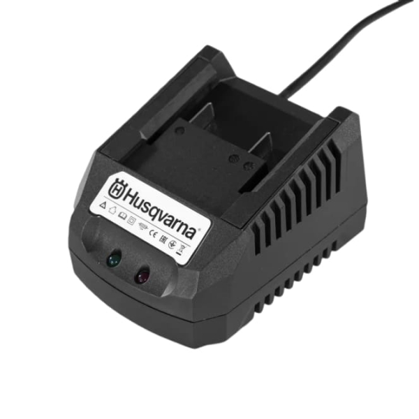 - Зарядний пристрій Husqvarna вольтажем 100-240 В і частотою струму 50-60 Гц для швидкого та безпечного заряджання акумулятора.
