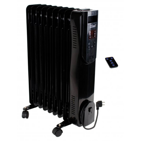 Масляний радіатор Zilan ZLN3031 із налаштуванням потужності 3 положеннями, максимальне значення — 2 кВт. Пристрій із 9 ребрами, 5 масляними каналами. Ефективно обігріває кімнату площею до 20 м2. Має електронне управління, функції підтримки температури, програмування на 12 год вперед. Укомплектований пультом дистанційного управління, транспортувальними колесиками. Важить 11 кг.