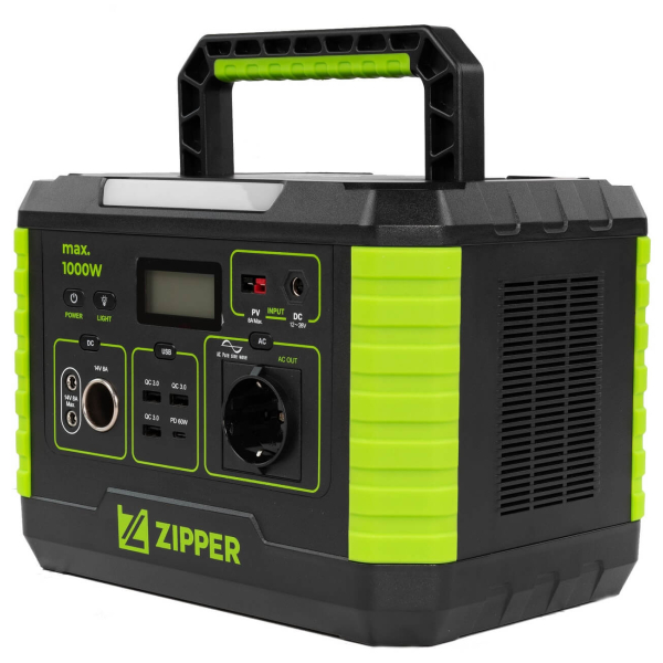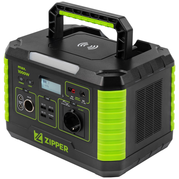 Зарядна станція Zipper ZI-PS1000 потужністю 1000 Вт. Акумулятор на 999 Вт/год з можливістю зарядки від сонячних панелей. Чистий синус, модуль бездротової зарядки. Інтерфейси: 1 євророзетка, 2 порти постійного струму, порт автомобільного прикурювача, 4 USB. З ліхтариком.