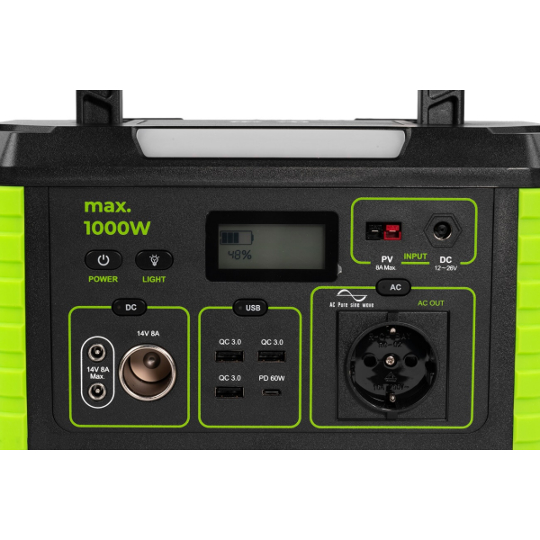 - Портативна зарядна станція для підключення побутових електроприладів і гаджетів вирізняється великою потужністю у 1000 Вт (1100 +/- 80 Вт пікової потужності на 3-5 секунд) та ємнісним Li-Ion акумулятором на 999 Вт/год (270 А/год) напругою 3.7В. Корисна ємність — 749.25 Вт/год. Розрахований на 500 циклів повної зарядки.