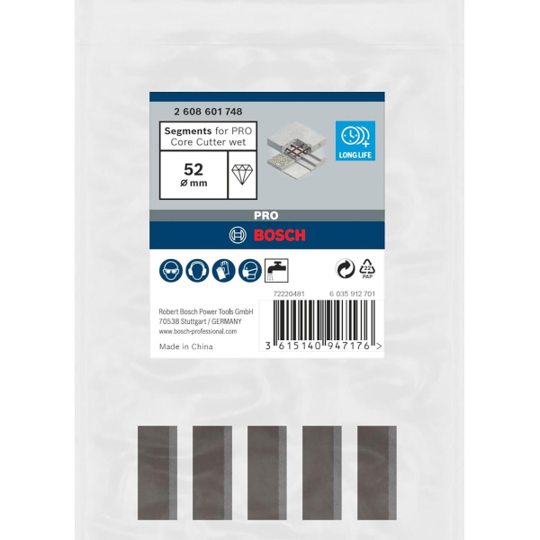 - Змінні алмазні сегменти Bosch PRO Core Cutter wet у кількості 5 штук з висотою 10 мм призначаються для встановлення на коронки діаметром 52 мм з кріпленням 1 1/4 UNC.