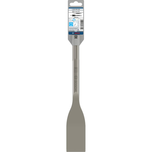 Потужне плоске зубило зі скошеним полотном і можливістю самозаточування. Має довжину 300 мм і ширину ріжучої кромки 50 мм для зняття плитки зі стін і демонтажу облицювальних покриттів. Підходить до перфораторів і відбійних молотків із патроном SDS-Max.