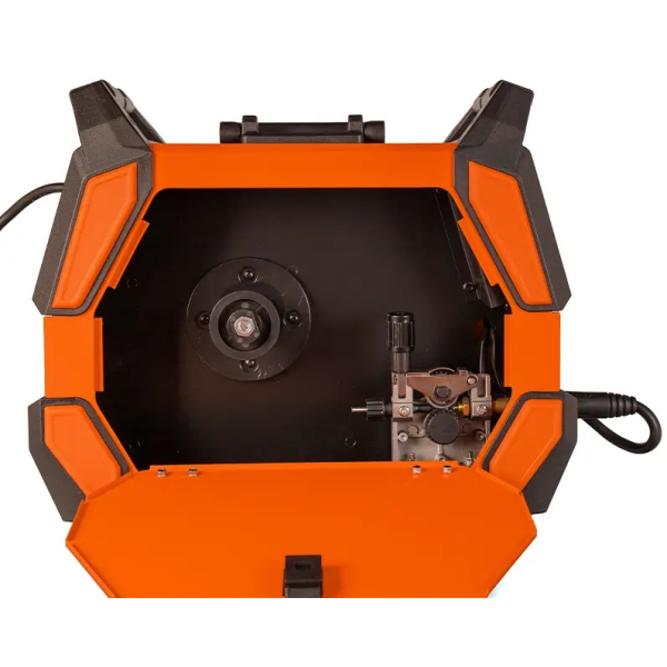 - Двороликовий механізм подачі дроту виконаний в посиленому варіанті — з двома шестернями зверху і двома знизу, що гарантує стабільну і рівномірну подачу. Він вбудований в корпус джерела, а підключення пальника здійснюється через роз'єм KZ-2. Максимальна довжина шланг-пакета становить 3 метри. Апарат підтримує роботу з дротом діаметром 0.6, 0.8, 0.9 і 1 мм.